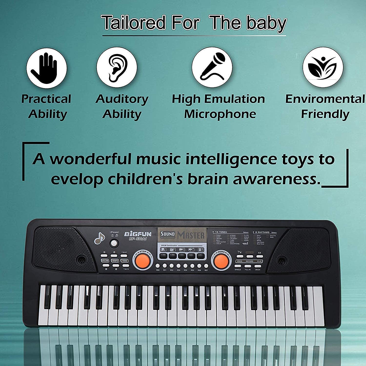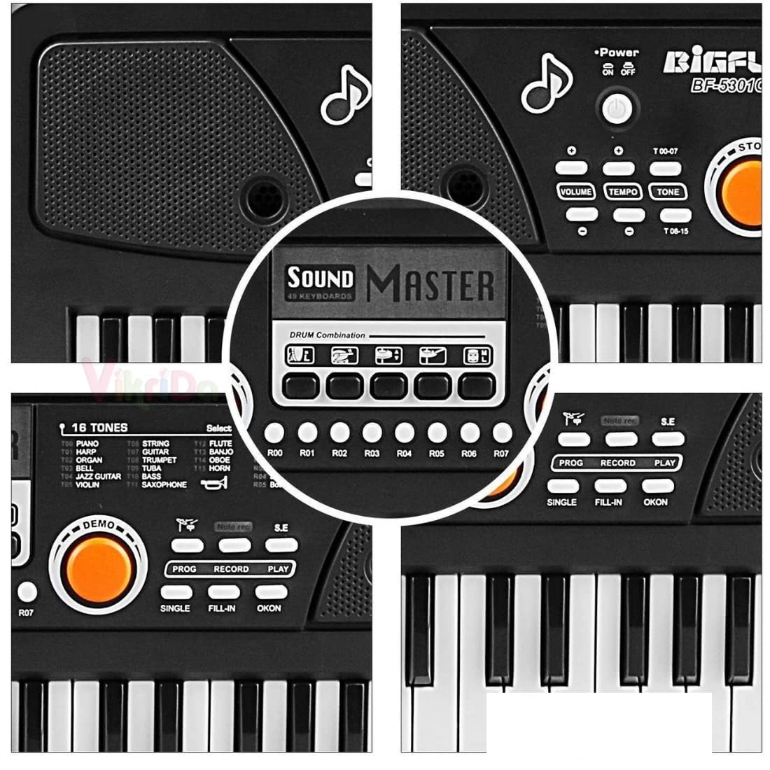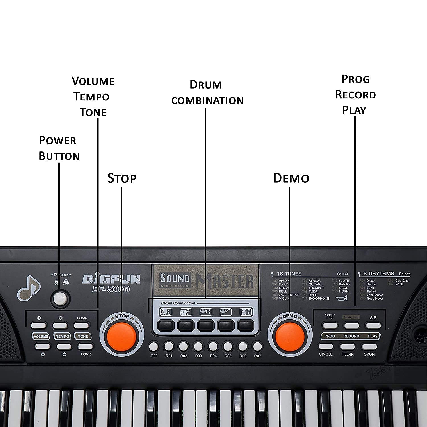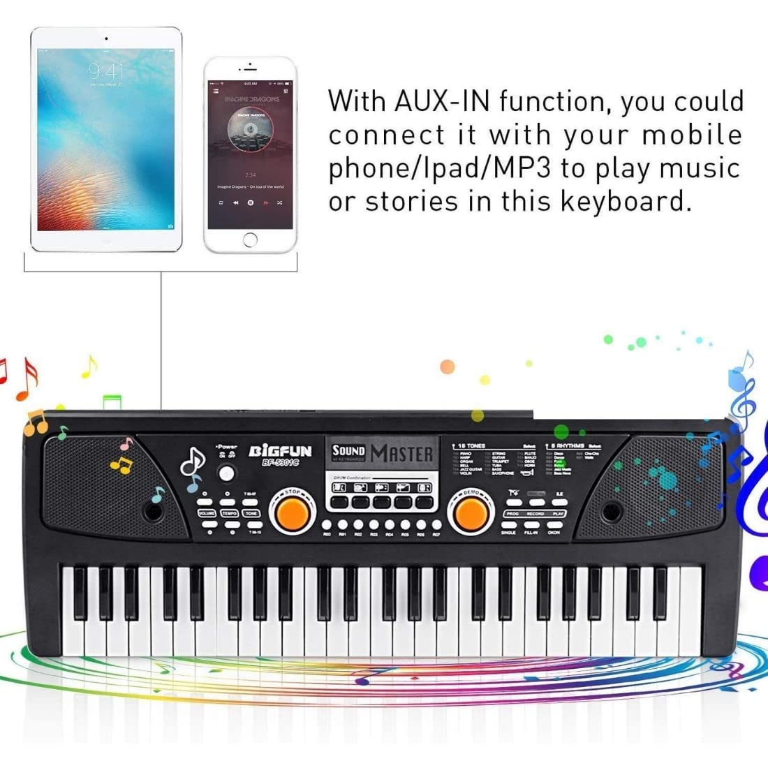 - This Piano Keyboard has 49 keys and 8 tones, 8 rhythms 4 percussions. Comes with DC Power Option, Recording and Mic. Direct dc power mode option: connect you mobile charger to play on dc power. Power saving mode: it can be easily powered on by connecting android mobile phone charger or by USB cable connected with any computer or even power banks(USB Included)