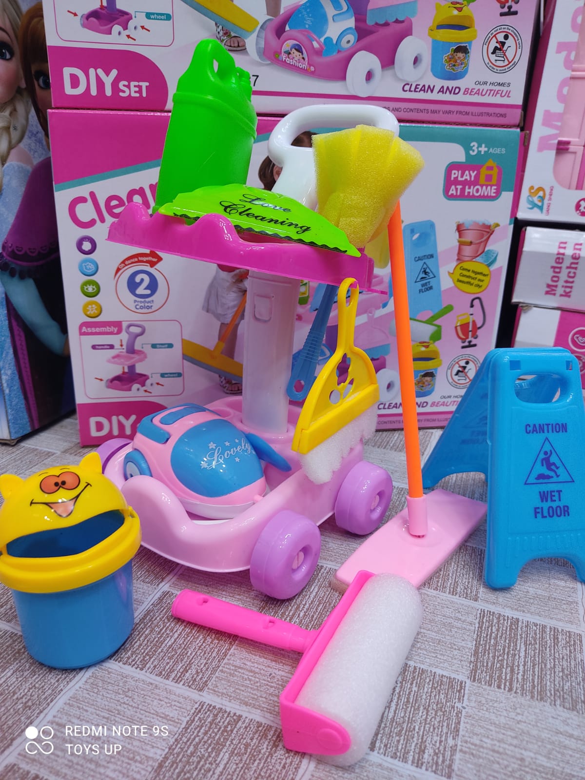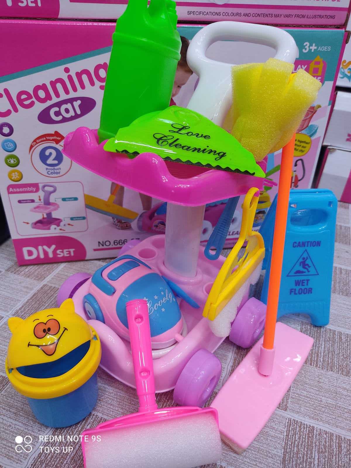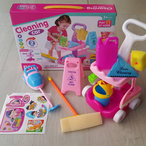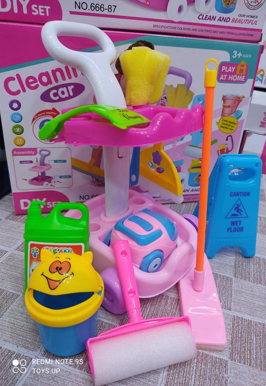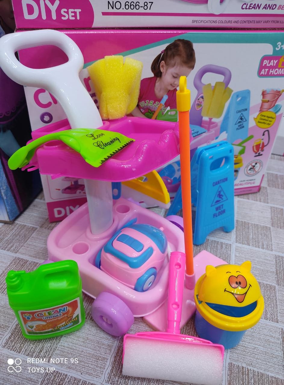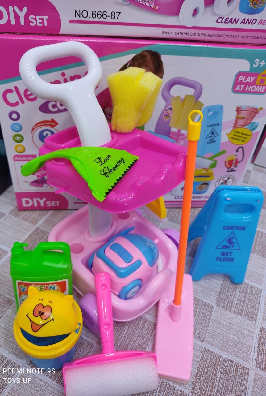 Let your little boy or girl follow you around the house with this wheeled cart, complete with set of pretend cleaning tools